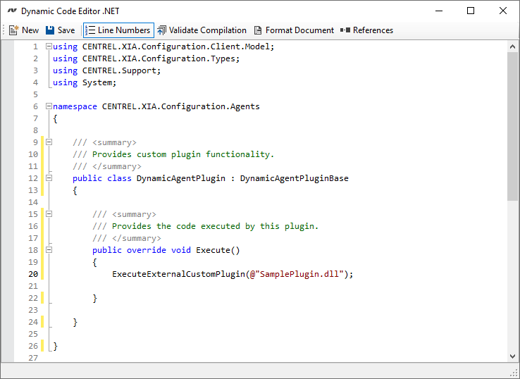 C:\Program Files\CENTREL Solutions\XIA Configuration\XIA Configuration Service - The external .dll file must be executed from the dynamic code editor from an assigned plugin with the ExecuteExternalCustomPlugin command, passing the filename of the plugin as the parameter.