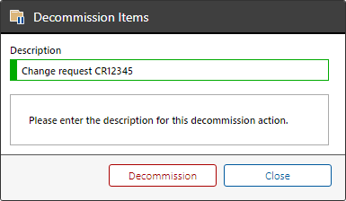 To decommission an item, select the item or items within the user interface, right click, and select decommission within the decommissioning context menu.