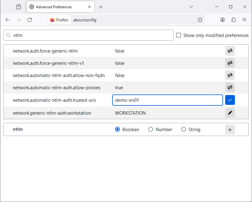 - Click click the edit button next to the network.automatic-ntlm-auth.trusted-uris field and enter the XIA Configuration Server name or fully qualified domain name that is used to access XIA Configuration Server (not the full URL).